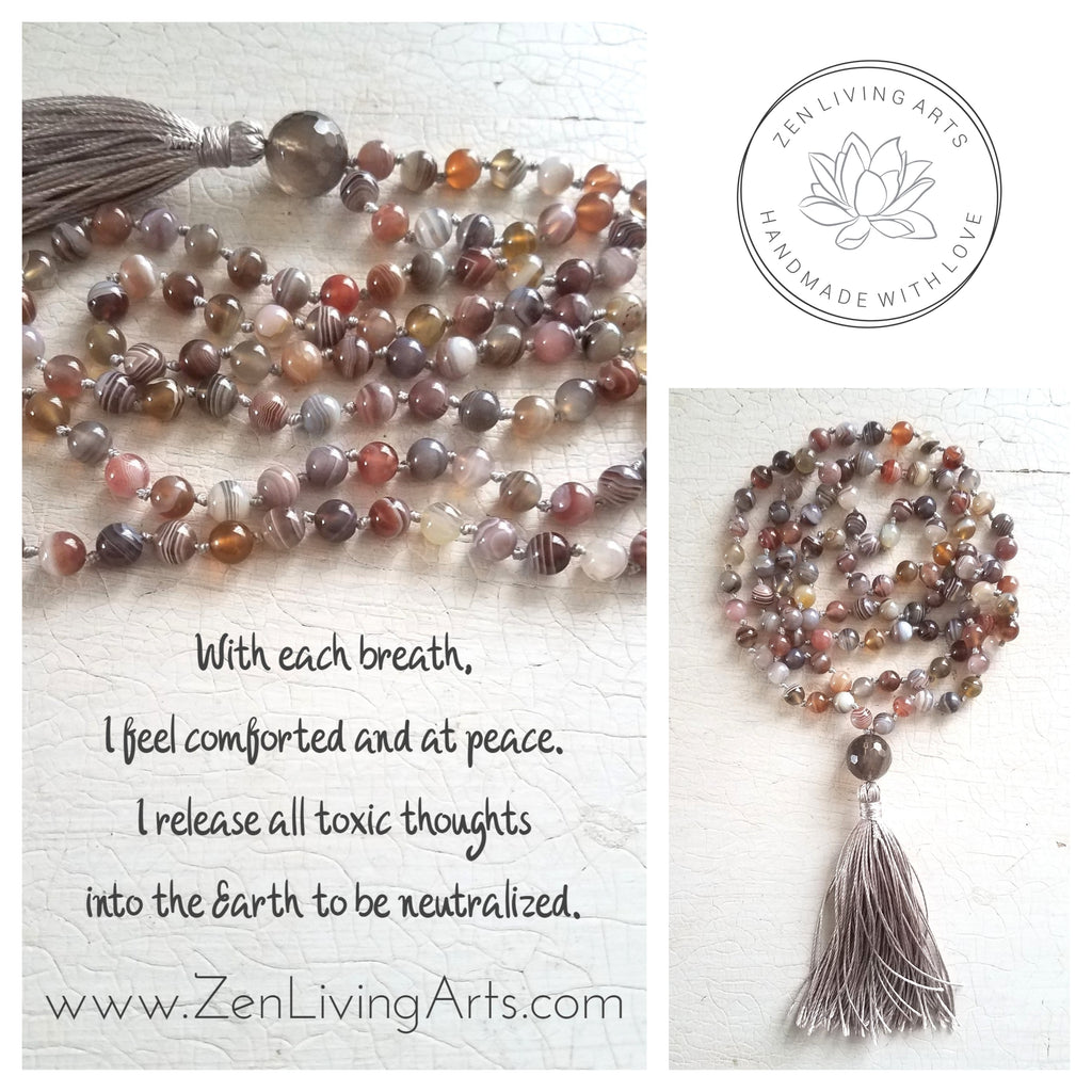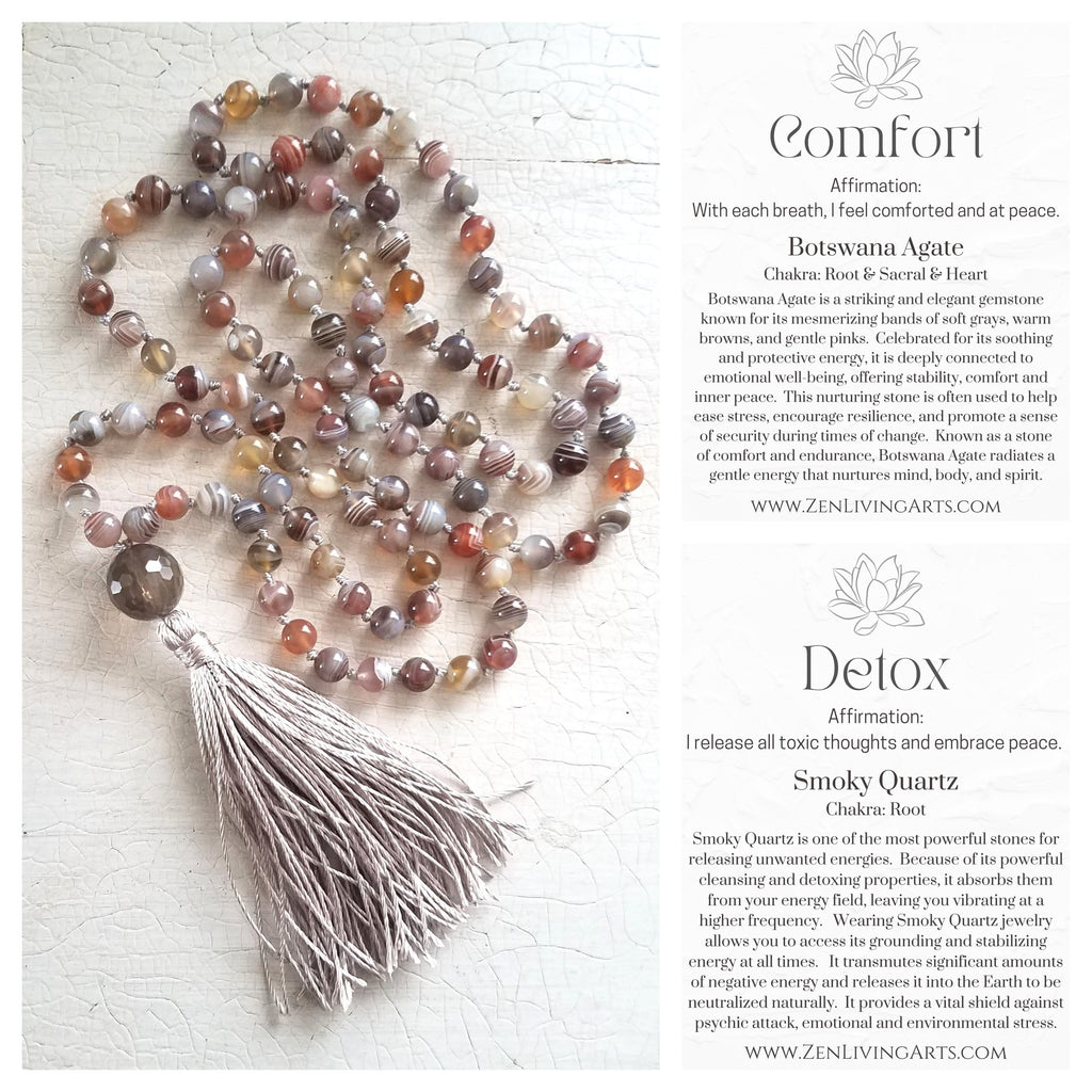 Comfort and Peace. Botswana Agate and Smoky Quartz Crystals Gemstones. Full Mala 108 Prayer Beads. Silk Tassel. Crystal Energy Healing. Reiki Jewelry. Handmade Artisan Gemstone Jewelry. Natural. Unique. Rustic. Organic. Balancing Your Chakras. Sacral Chakra. Heart Chakra. Root Chakra. Japamala Meditation. Wear Your Intention. Vibrate Higher.