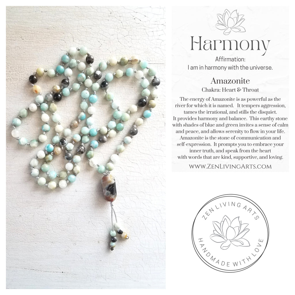 TRUTH AND HARMONY. Amazonite Crystals Gemstones Silk Tassel. Full Mala 108 Prayer Beads. Mindfulness & Meditation.
