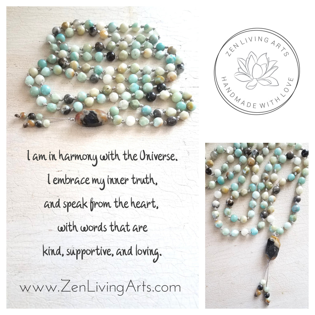 Truth and Harmony. Amazonite Crystals Gemstones. Full Mala 108 Prayer Beads. Silk Tassel. Jen's Zen Den. Crystal Energy Healing. Reiki Jewelry. Handmade Artisan Gemstone Jewelry. Natural. Unique. Rustic. Organic. Balancing Your Chakras. Throat Chakra. Heart Chakra. Energy Healing. Japamala Meditation. Wear Your Intention. Vibrate Higher.