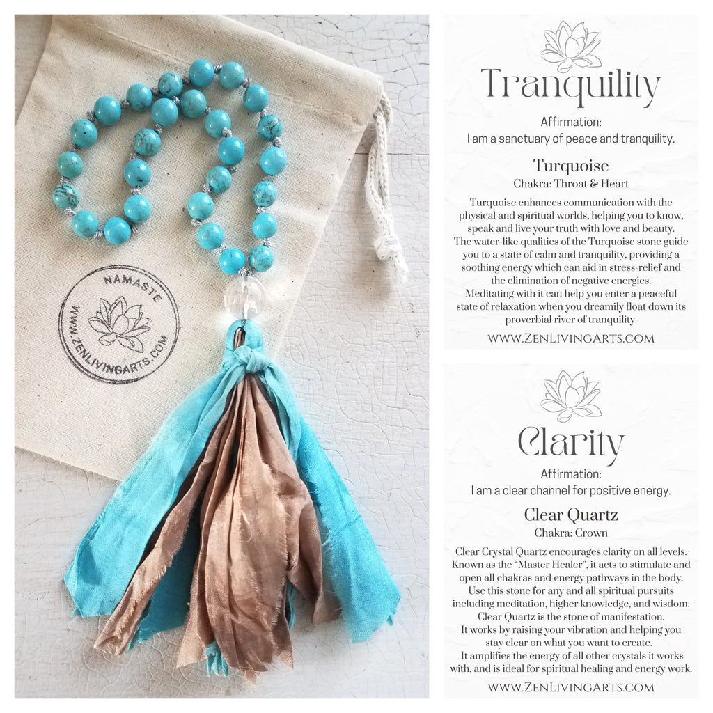 Tranquility. Blue Turquoise and Clear Quartz Crystal Gemstone Pocket Mala. Mini Mala. Quarter Mala 27 Prayer Beads. Faceted Crystals. Energy Healing. Handmade Artisan Gemstone Mala. Sari Silk Tassel. Natural. Unique. Rustic. Organic. Balancing Your Chakras. Healing. Cleansing. Japa Meditation. Carry Your Intention. Vibrate Higher.