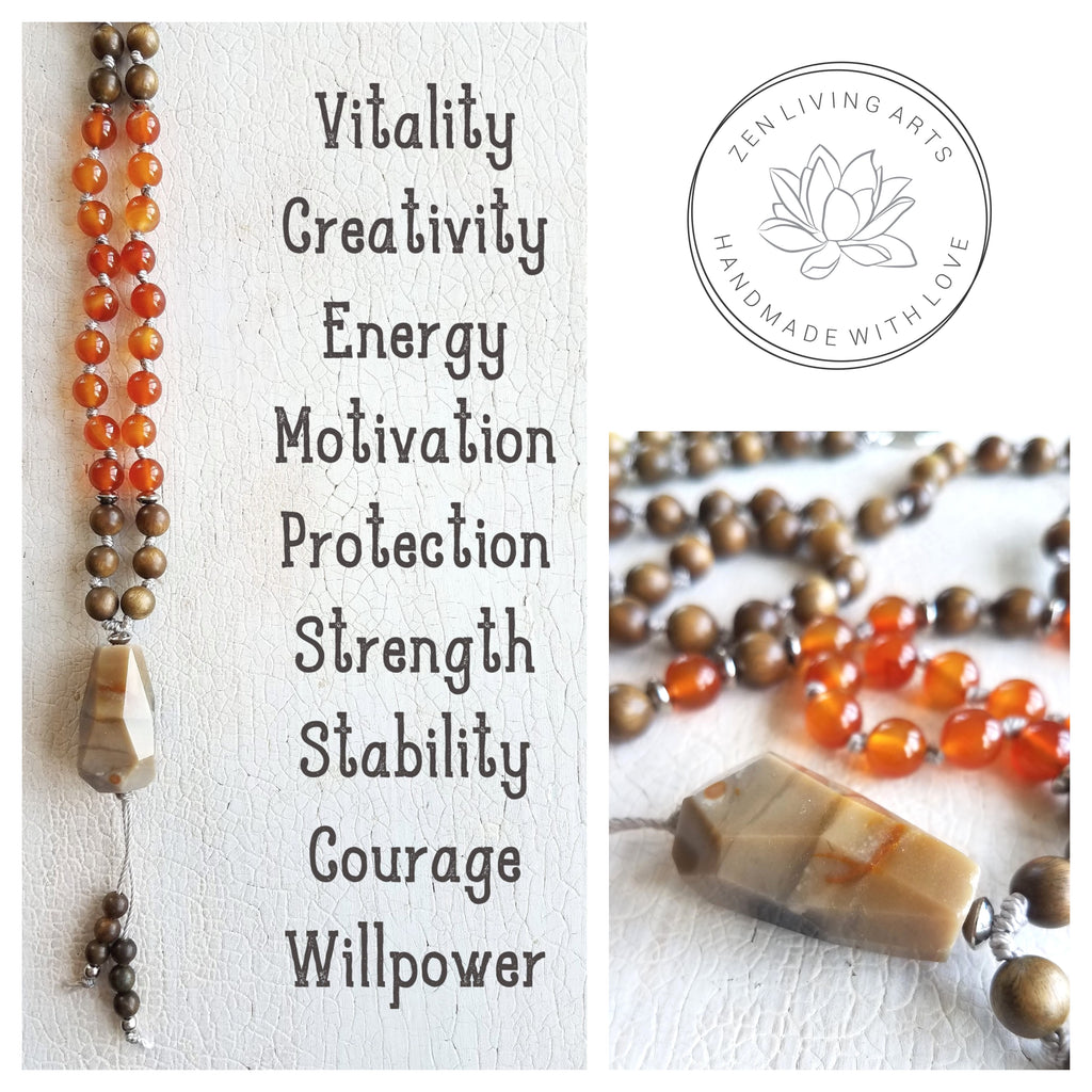 Creative Soul. Fragrant Sandalwood, Orange Carnelian Gemstone, and Petrified Wood Stone Necklace. Tree Of Life. Full Mala 108 Beaded Tassel Necklace. One-Of-A-Kind. Crystal Energy Healing. Reiki Jewelry. Handmade Artisan Gemstone Jewelry. Natural. Unique. Rustic. Organic. Balancing Your Chakras. Sacral Chakra. Creativity. Grounding. Energy Healing. Japa Meditation. Wear Your Intention. Vibrate Higher.