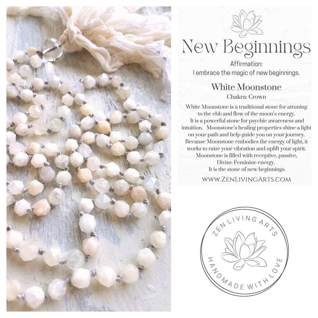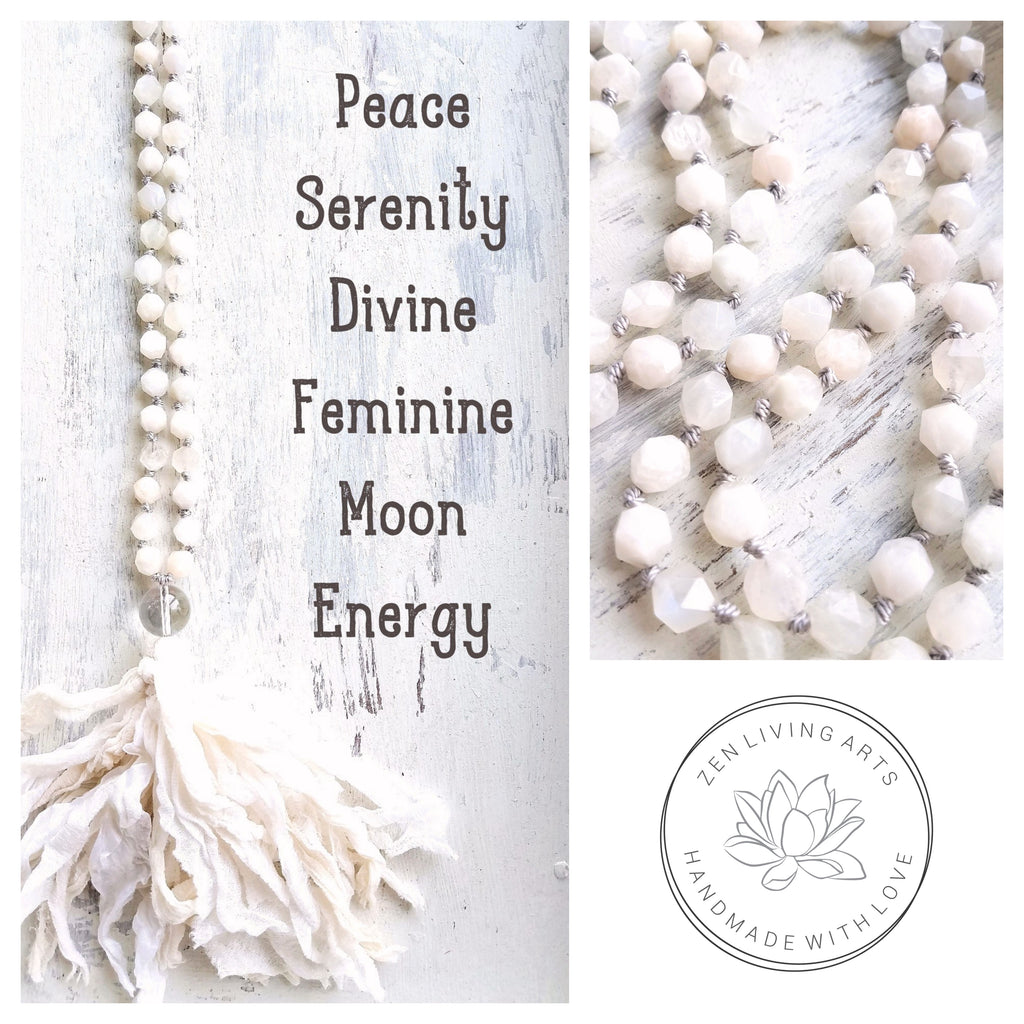 Illumination. Creamy White Iridescent Moonstone Gemstone Necklace. Full Mala 108 Beaded Tassel Necklace. Crystal Energy Healing. Reiki Jewelry. Handmade Artisan Gemstone Jewelry. Natural. Unique. Rustic. Organic. Balancing Your Chakras. Crown Chakra. Divine Feminine Energy Healing. Japa Meditation. Wear Your Intention. Vibrate Higher.